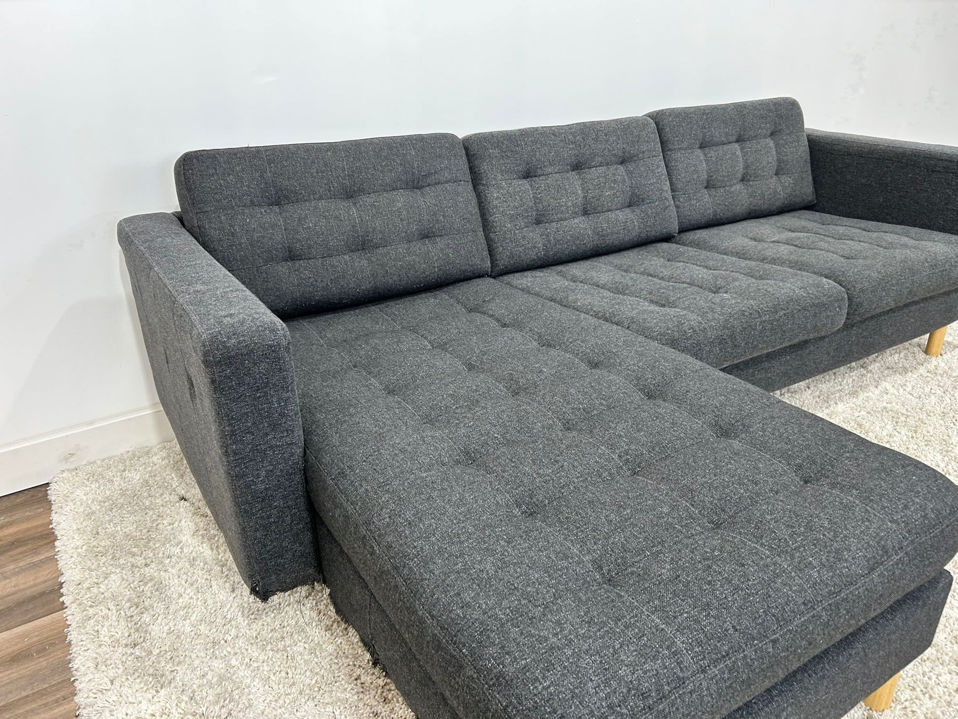 Condition: Fair, side of chaise damaged by previous owners dog