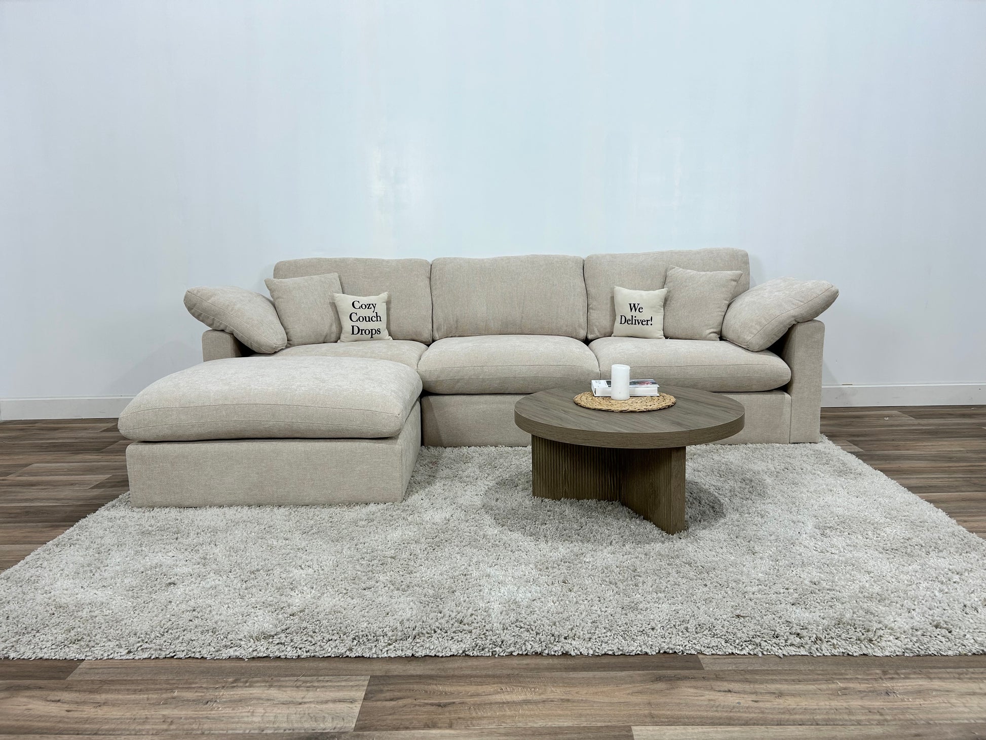 The chenille upholstery is soft to the touch and built for everyday use — durable enough to handle real life without feeling precious. Removable ottomans let you shift the layout to fit your space, and six toss pillows are included.