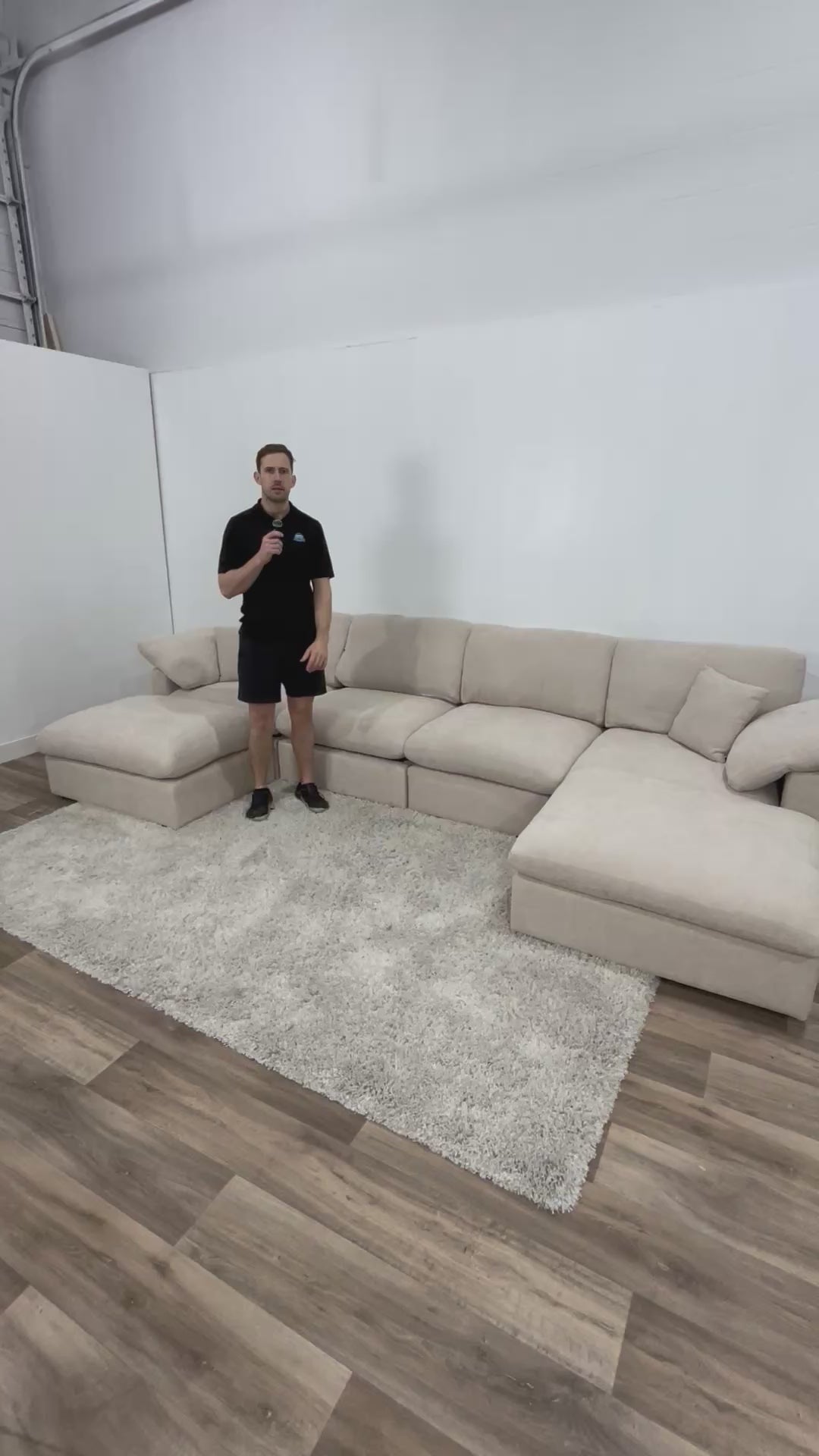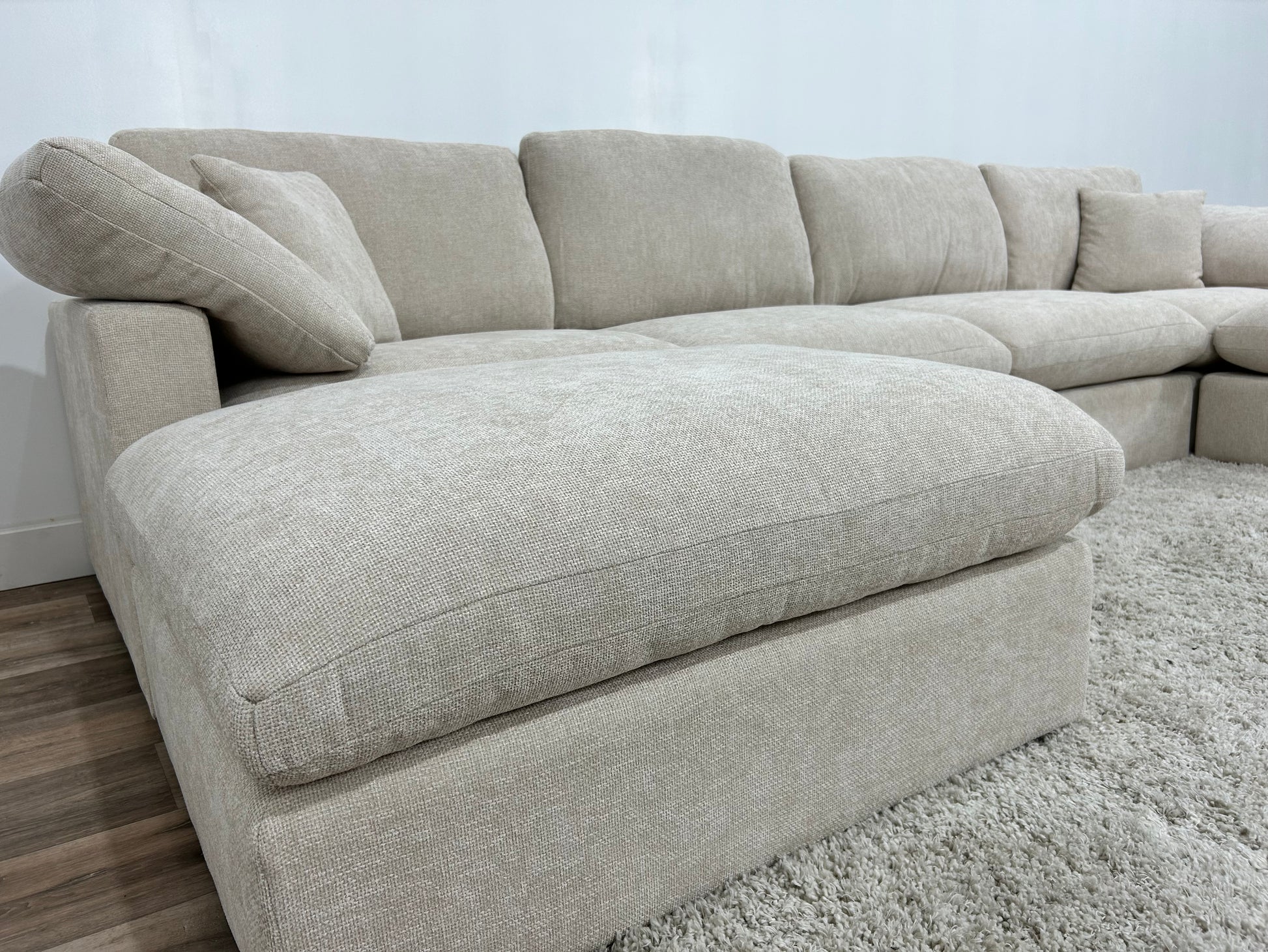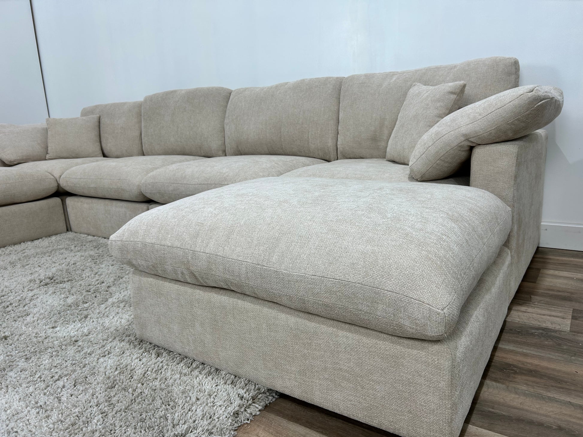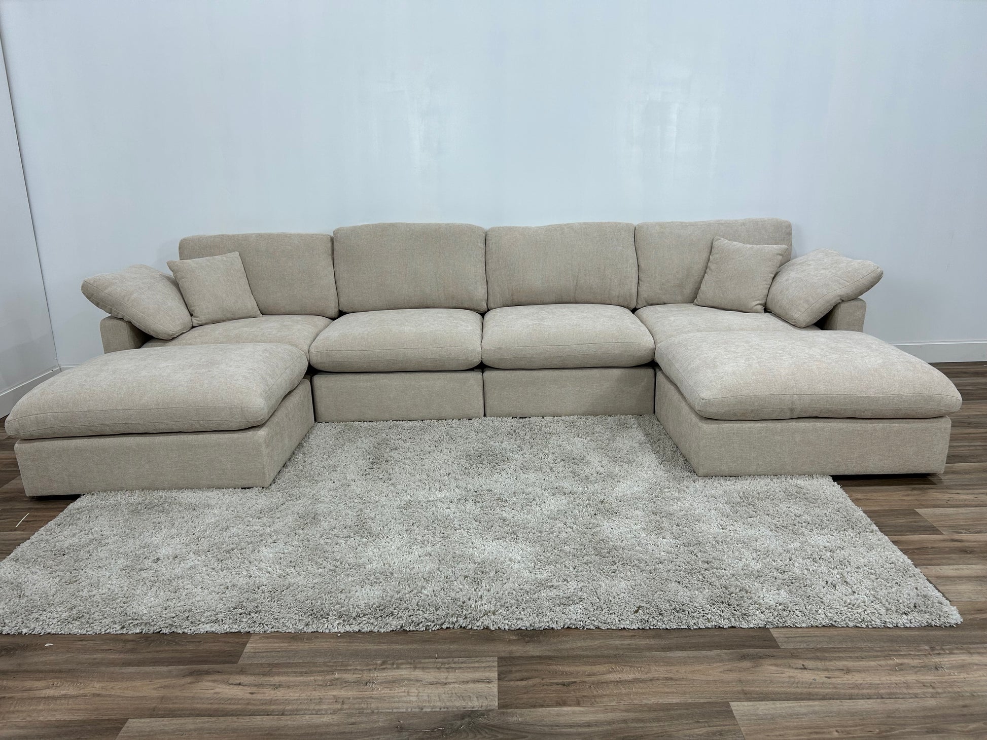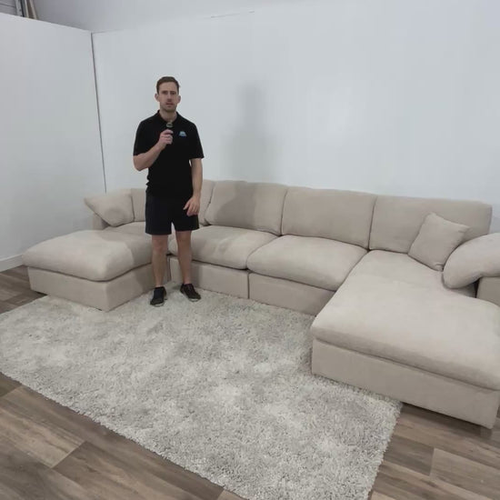 This is a big, deep, sink-into-it modular sofa — the kind you don't want to get up from. The cloud-style cushions are seriously plush (foam and poly fibre construction), and the U-shape gives you plenty of room to spread out. Seats up to 6 people comfortably.